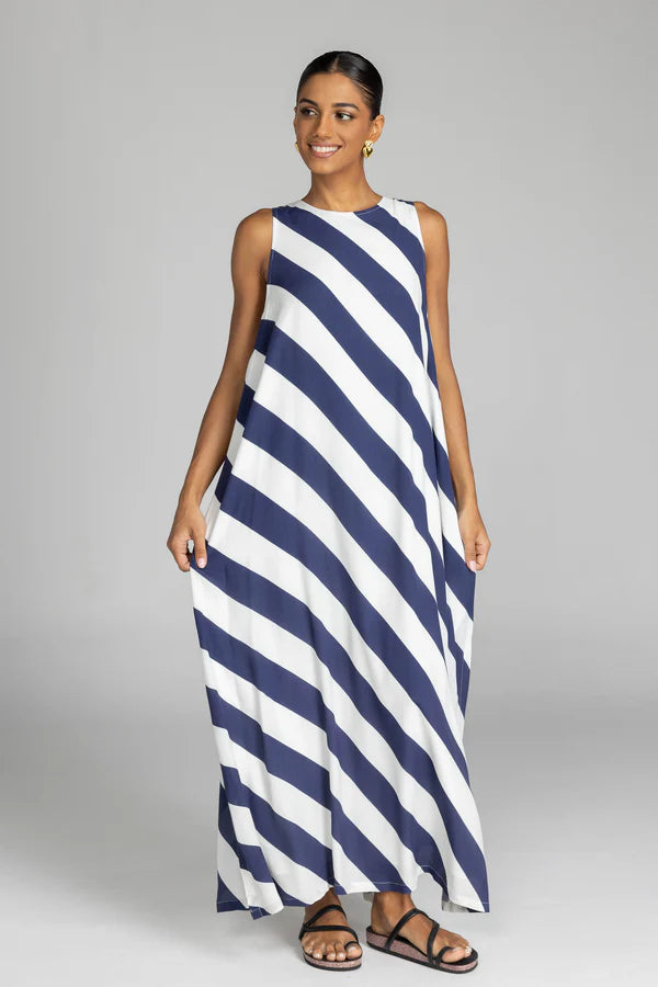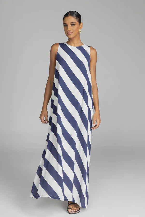 The distinguished Finally Here Dress presents our signature silhouette in premium rayon viscose with an elegant navy and white diagonal stripe pattern, featuring a refined high neckline and sleeveless construction. Thoughtful details include a discreet back keyhole with button closure and precise side splits, creating a versatile silhouette that accommodates diverse body types with sophisticated ease.