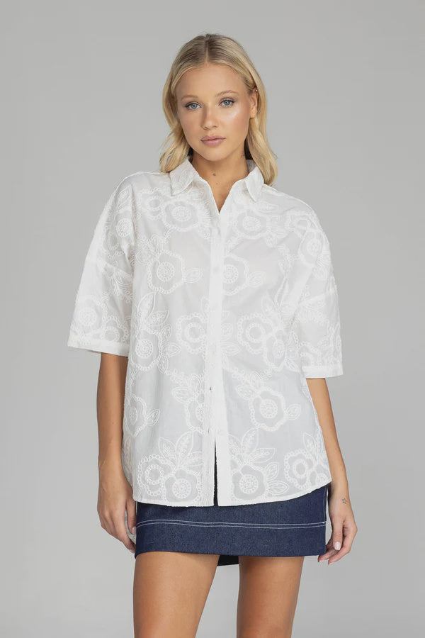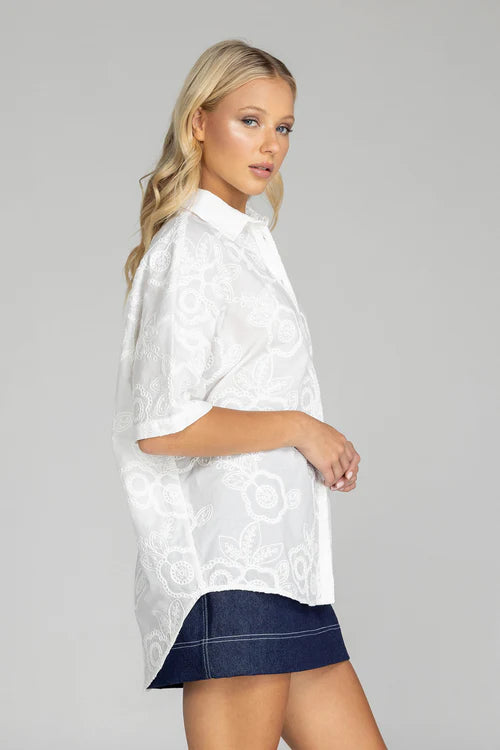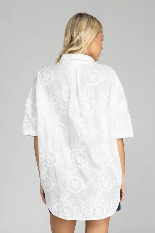 The exemplary Santiago Shirt in White epitomizes cultivated minimalism at its finest. Adorned with a dignified button-through façade and a tailored collar, this garment represents the essence of subtle opulence. Its deliberate drop shoulder construction establishes a sculptural profile, harmoniously balanced by artfully calibrated short sleeves. The reverse features an inverted box pleat, simultaneously elevating its aesthetic virtue and wearing comfort. A refined curved hemline, thoughtfully elongated at the rear completes this must have shirt.