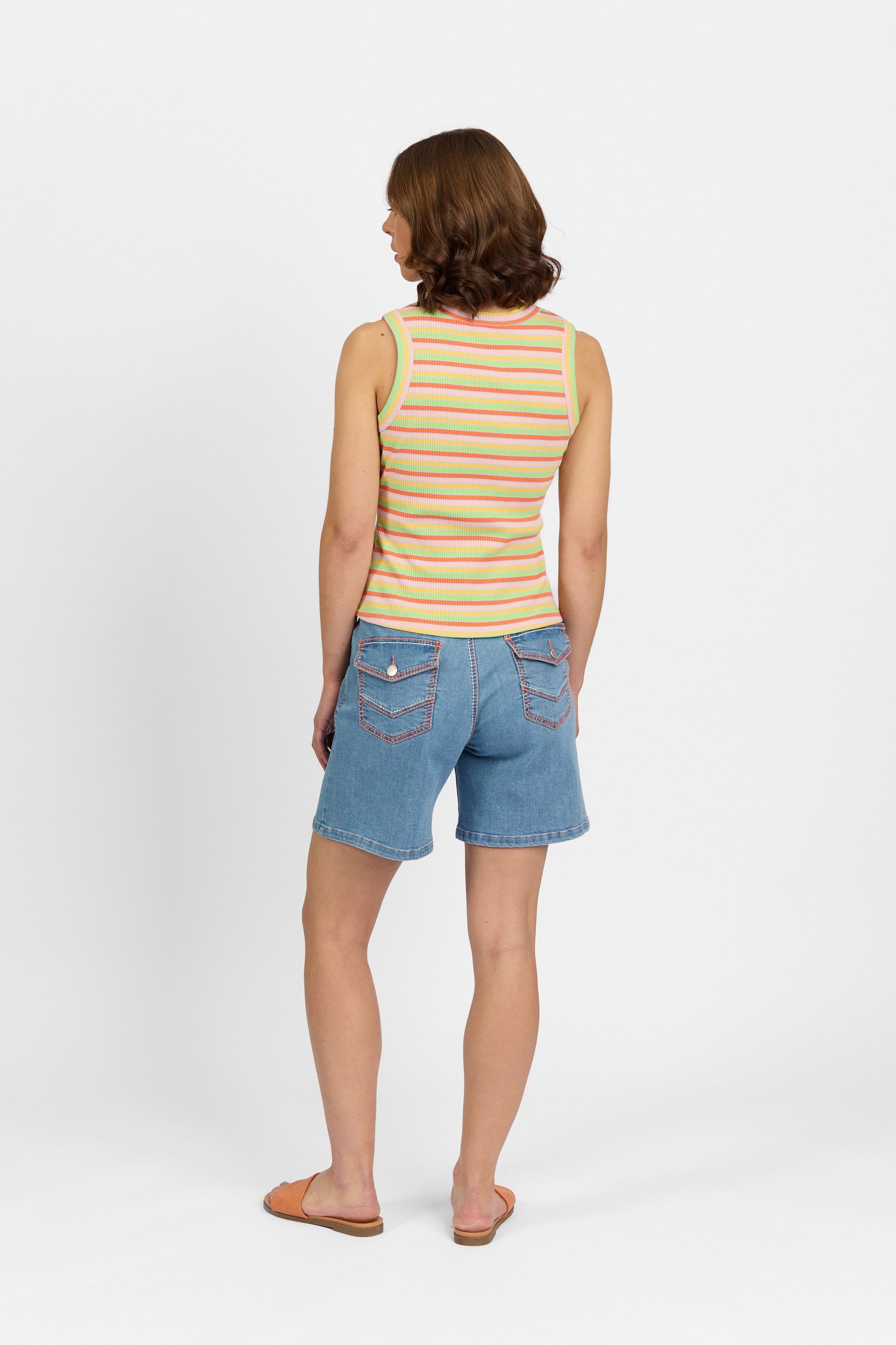 This style is designed to cover bra straps and to be the perfect length to tuck into high waisted bottoms or wear out with mid rise bottoms
