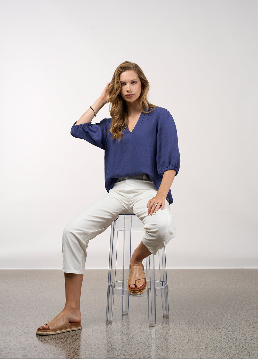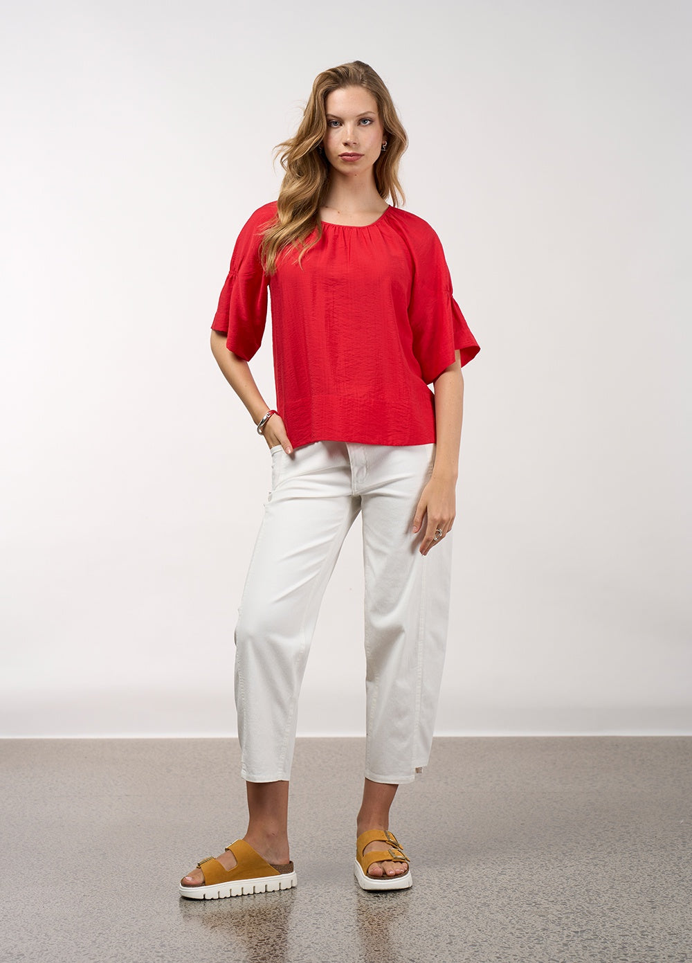 Relaxed fitted jean with a subtle tulip leg shape, with front angled pockets. Featuring side panels that are stepped at the hem, back patch pockets and signature MS branded hardware.