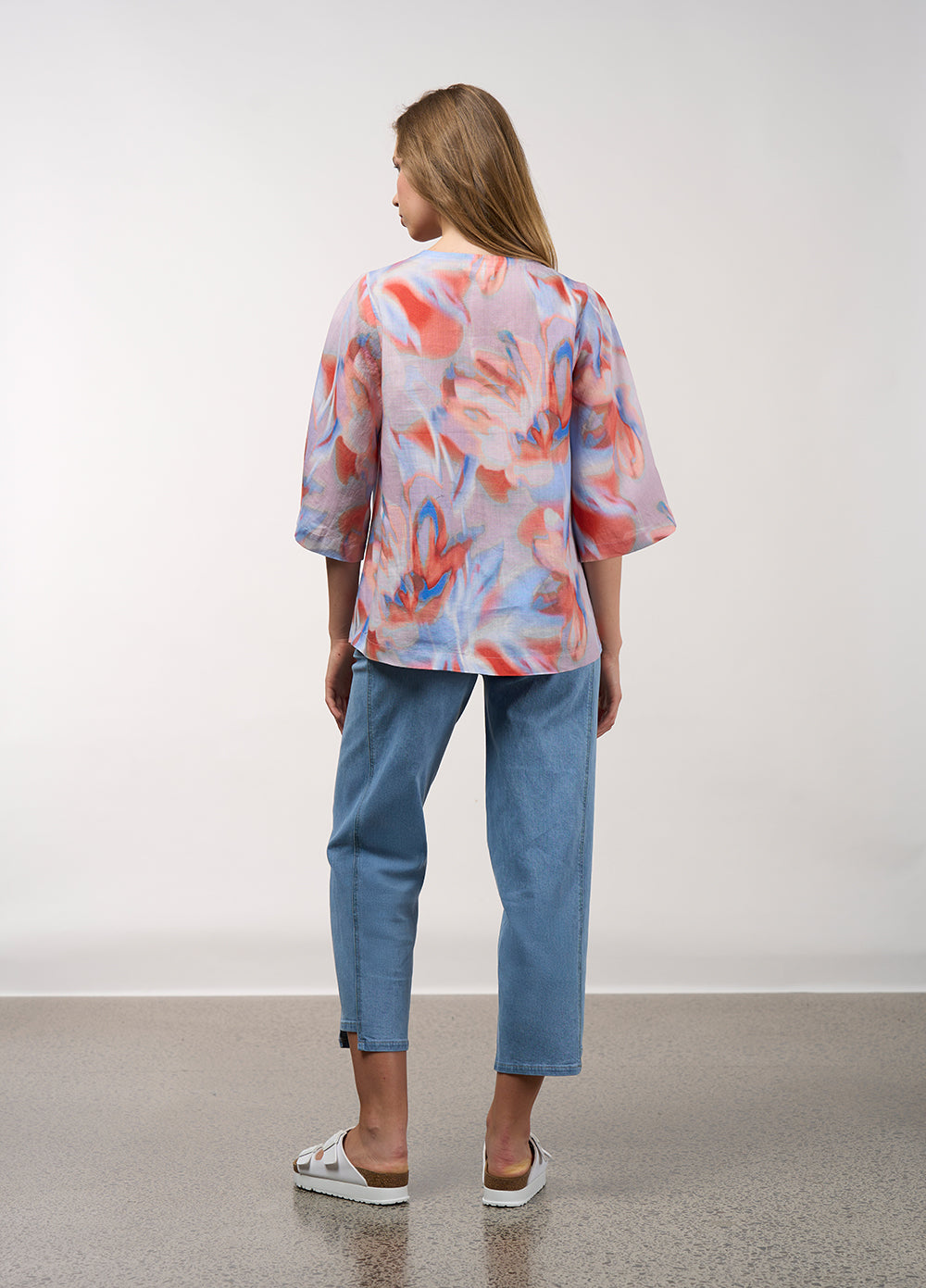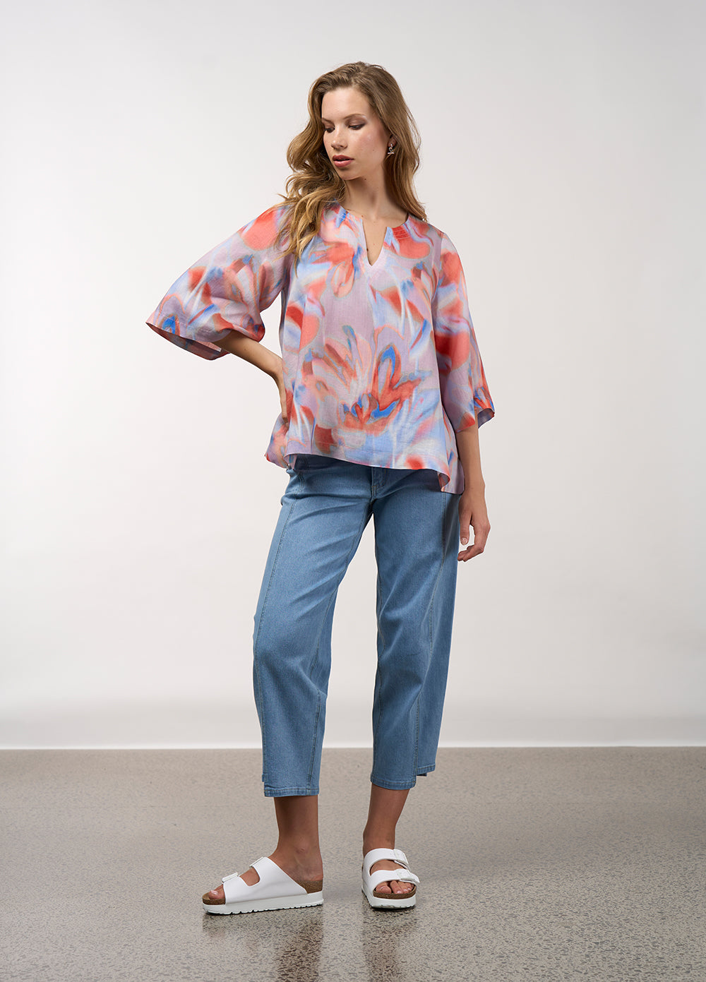 Relaxed fitting a-line top in soft printed ramie, with flared 3/4 length sleeves, topstitched detailing at the neckline and side splits at the hem.