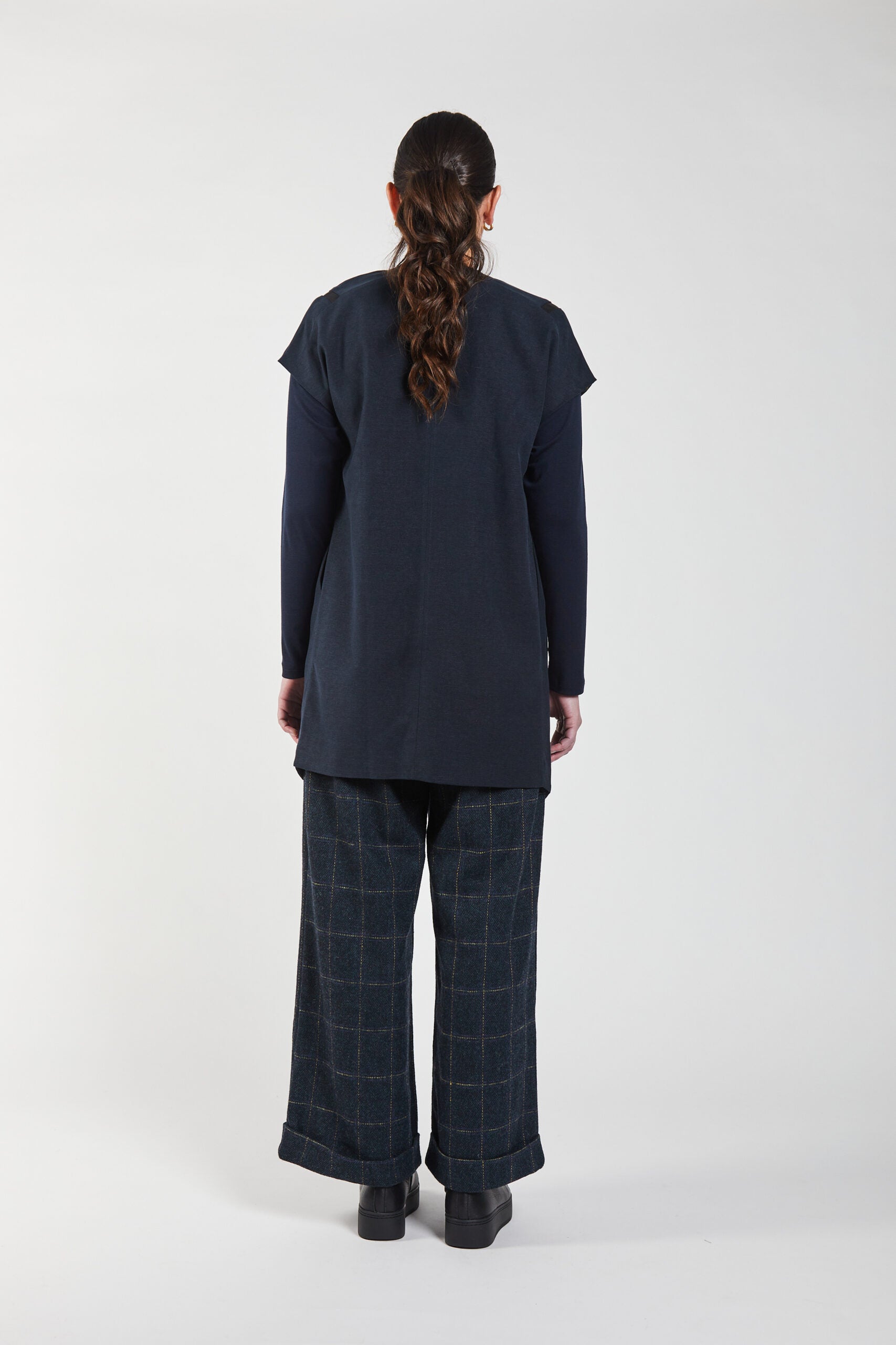 The back of the jerkin is clean and understated, cut in a smooth, uninterrupted line.