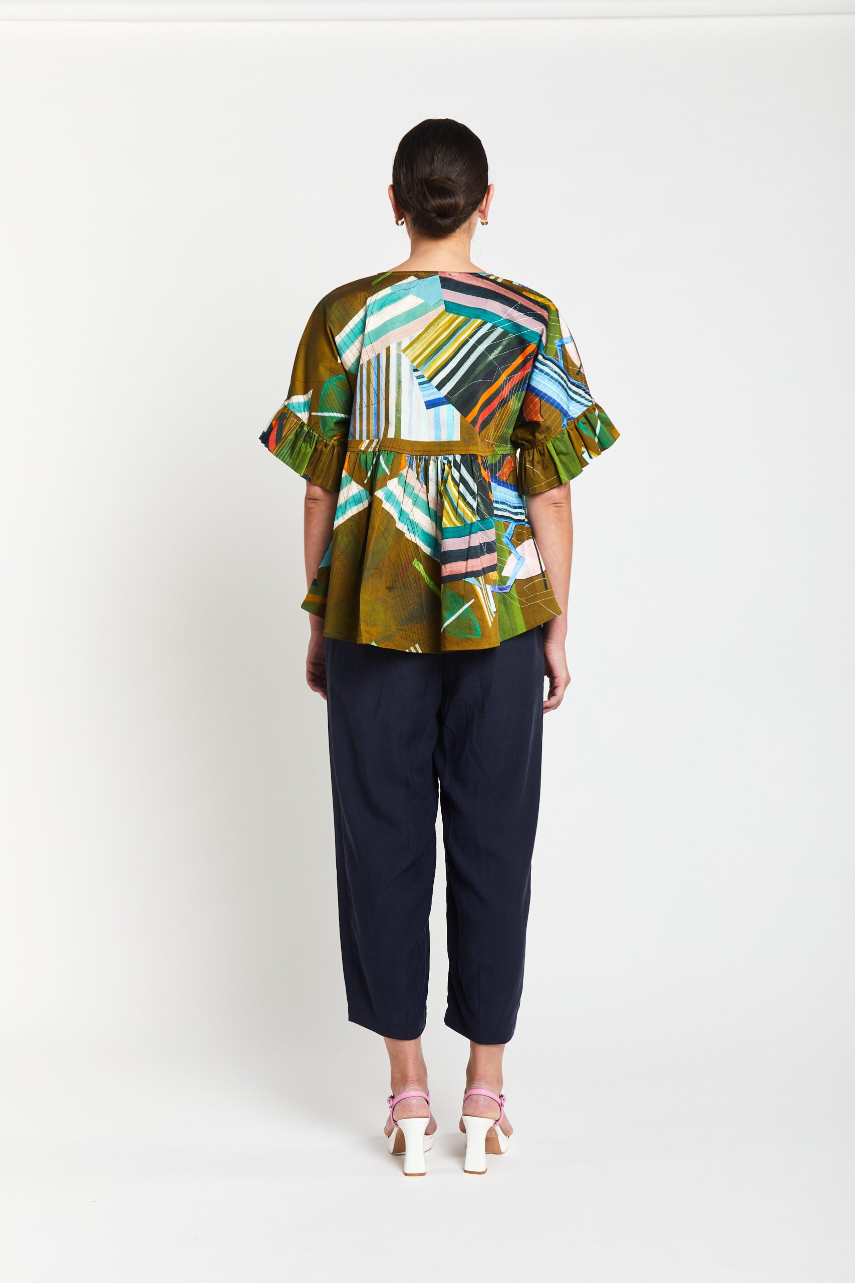 Artful and refined the Picasso Shell Top makes a confident statement with its striking abstract print, a vibrant kaleidoscope of colours set against a rich copper base.