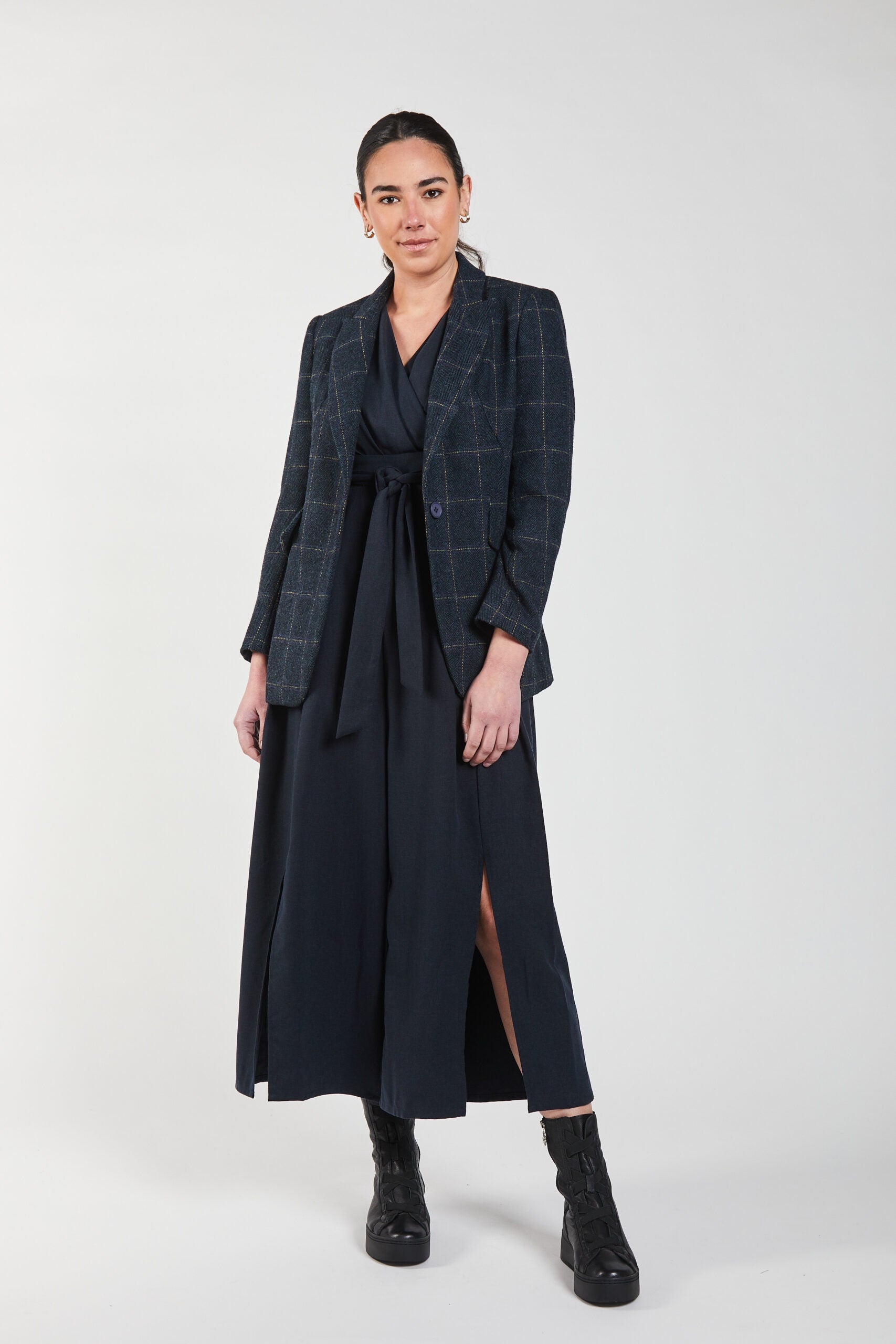 The Shamrock Blazer is a beautifully tailored wool-blend jacket that brings together classic menswear inspiration with a distinctly modern, feminine sensibility. Crafted from a rich, deep plaid, the fabric features a refined windowpane check woven in understated neutral tones.