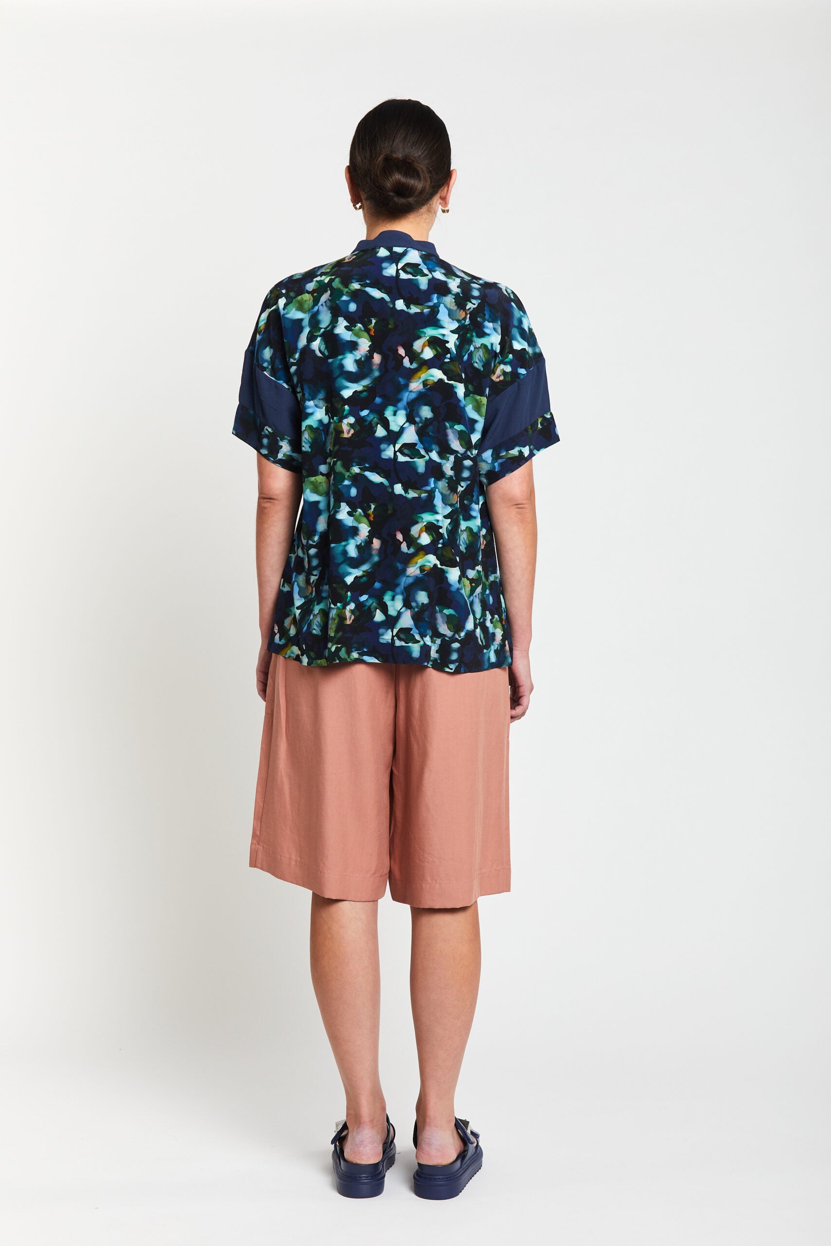 Featuring a soft stand navy collar and front button-through placket creating a clean, contemporary look, relaxed dolman style sleeves and additional panelled navy inserts, offering ease through the shoulders with cut in one bodice for a seamless silhouette.