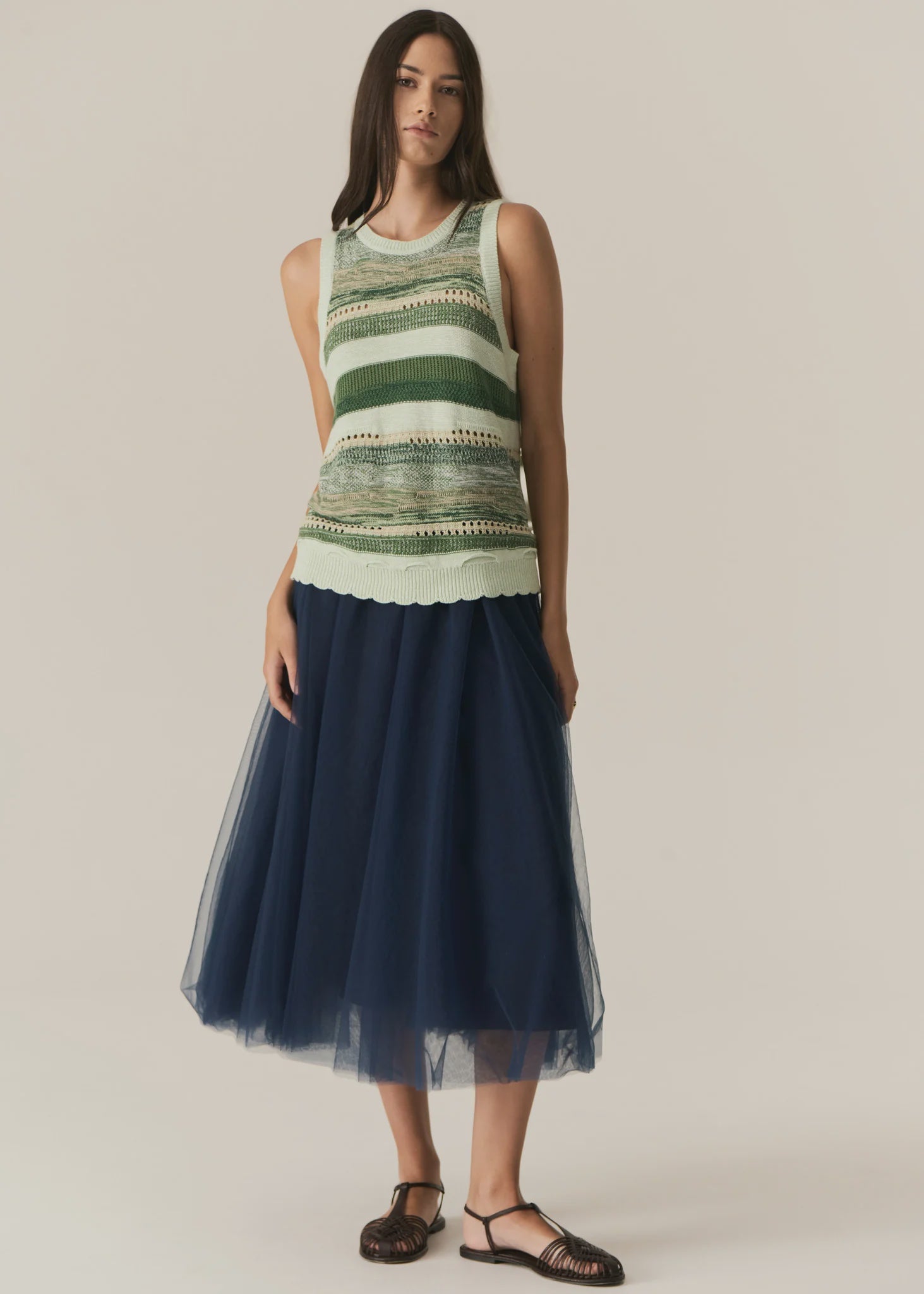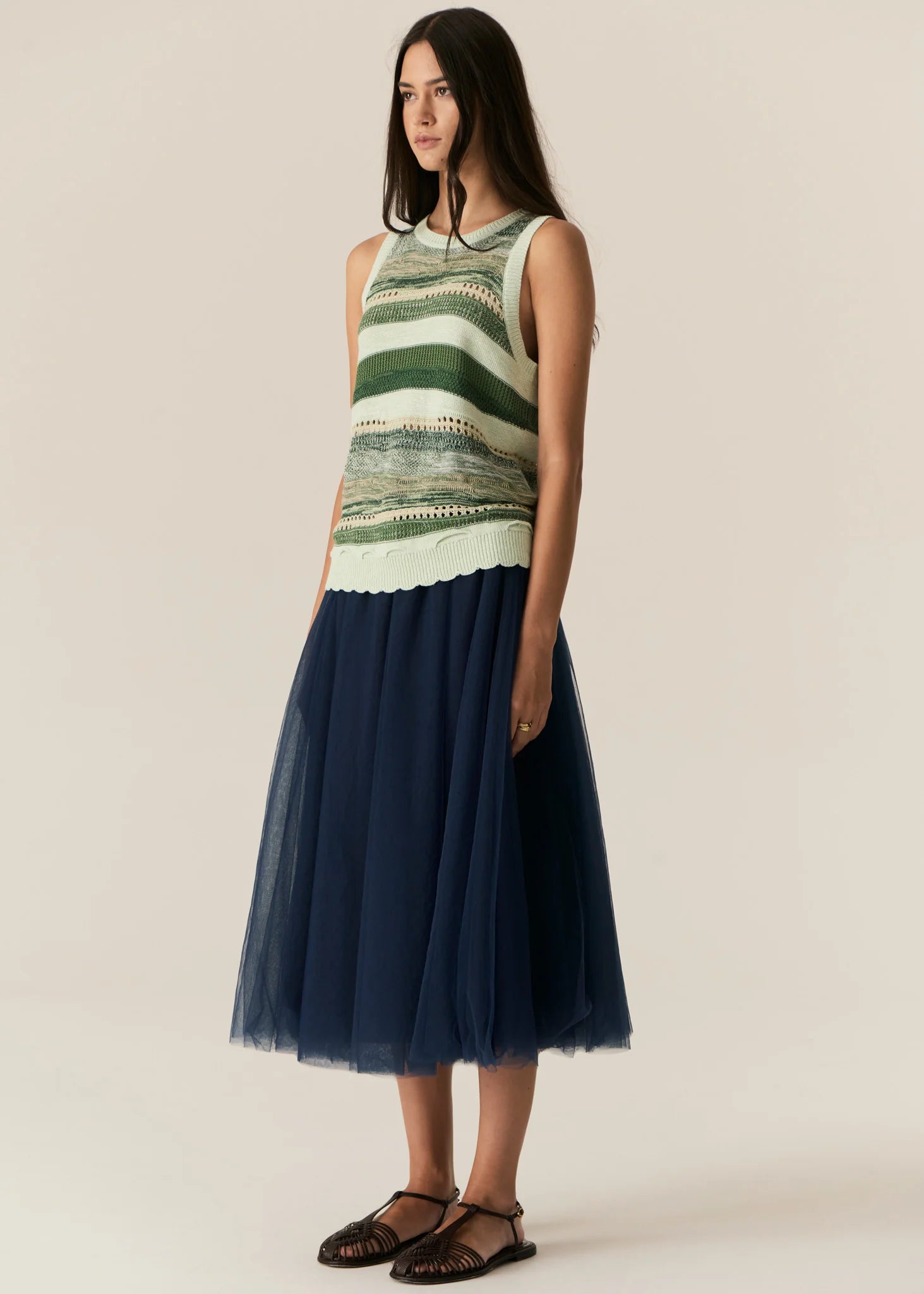 The Marc Multistripe Tank features multiple textures and knit stitches in a gorgeous green colourway.