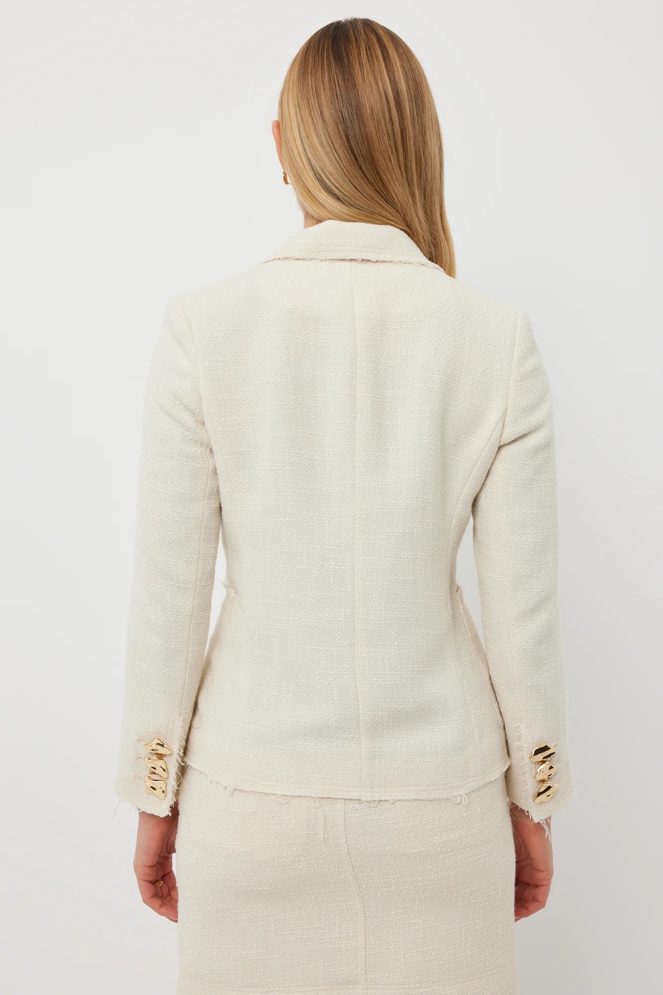 A refined new blazer shape, inspired by the timeless Chanel jacket. With a fitted silhouette and nipped in waist this style is beautifully feminine and wonderfully flattering. To keep the Jacket feeling modern and fresh added raw edge finishes and bold gold hardware.